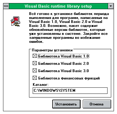 Это набор компонентов для Win16 программ, написанных на языках Visual Basic 1.00, Visual Basic 2.00 и Visual Basic 3.00. Такие программы написаны для систем вроде Windows 3.11, но работают даже в Windows XP. Без этих библиотек такие программы просто не запустятся. Этот набор потребуется во всех версиях Windows, особенно поздних вроде Windows XP. Для установки распакуйте архив куда-нибудь и запустите SETUP.EXE.