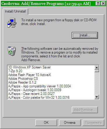 Это - очень полезная вещь, места для которой на сайте я так и не нашла. Это старый добрый апплет "Установка/удаление программ" в стиле Windows 98/NT4. Он работает и в Windows XP. Главная причина, почему я делюсь им - скорость. Стандартный апплет Windows XP может по пять минут искать, что там установлено в системе, а этот выводит список в одну секунду. Правда, при этом он не группирует заплатки, но в остальном проблем с ним не наблюдается.